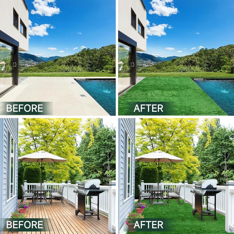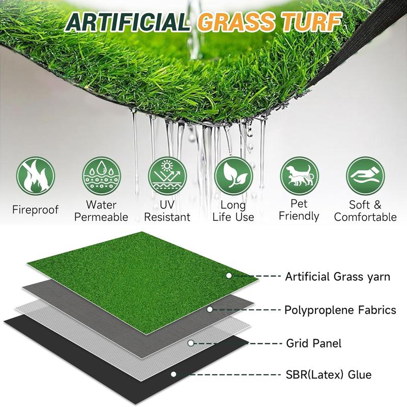 Easy to Maintain and Clean: Our fake grass lawn does not require watering and mowing, saving you time and energy; Artificial turf has air permeability on the back, making it easy to clean and maintain; If you want to keep it clean and odor-free, just rinse it with a hose; They can quickly drain away water and keep the lawn dry and fresh