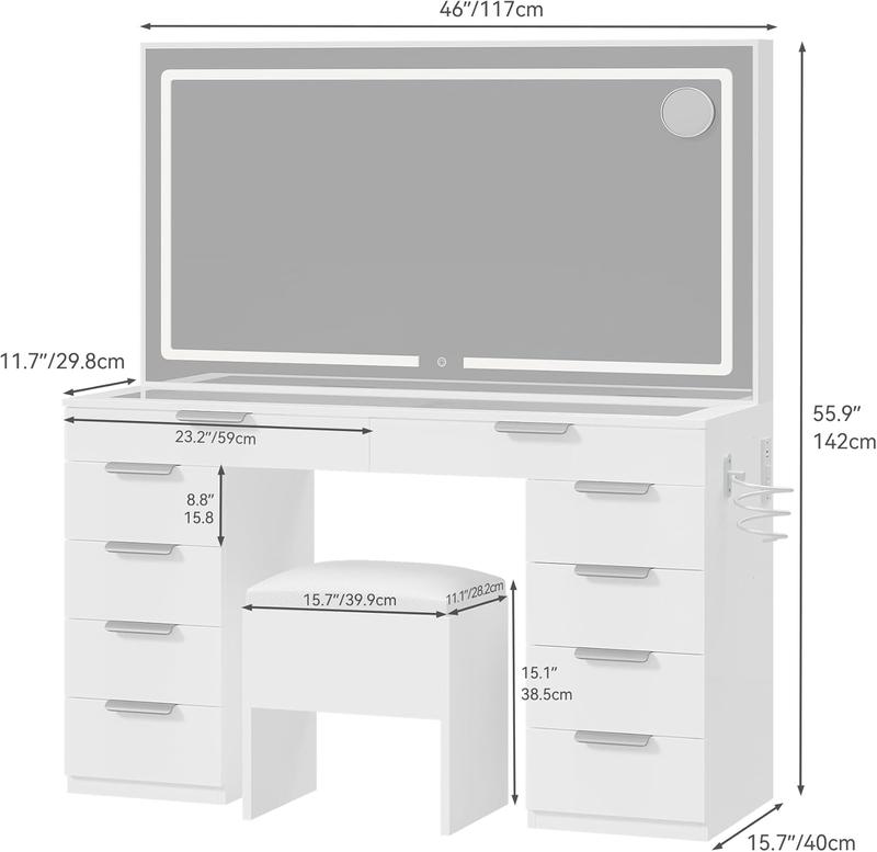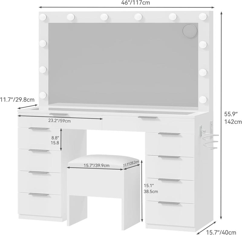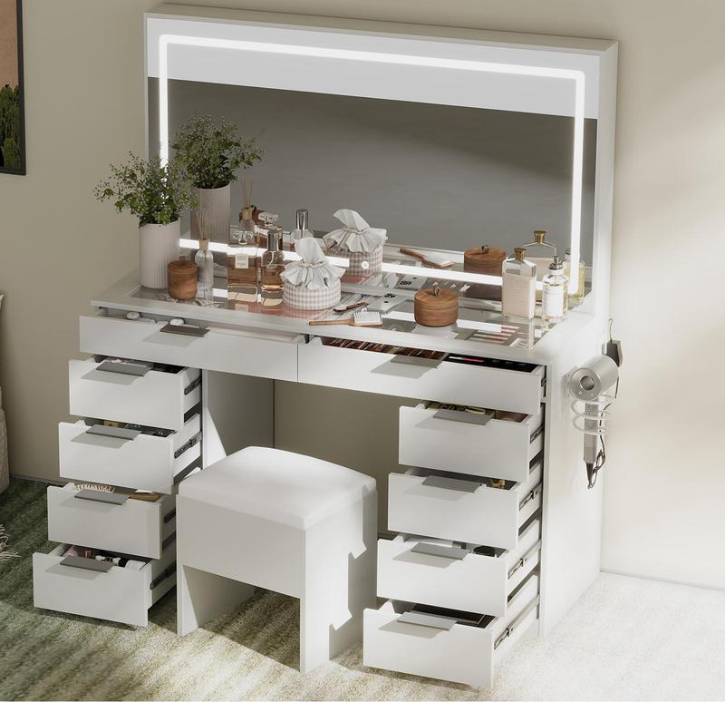 10 Drawers Large Storage: This make vanity table boasts 10 large drawers, each equipped with a handle to make your makeup area stays well organized, accommodating all your cosmetics; It elevates your bedroom with a touch of neatness and elegance