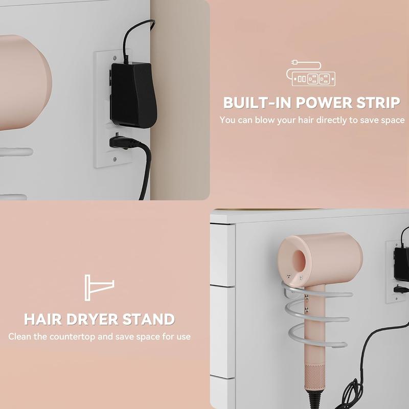 Built-in Charging Station and Hair Dryer Rack: This versatile makeup desk conveniently integrates 2 standard plug sockets, 2 USB ports, and 1 hair dryer rack, ensuring that your hair dryer, mobile phone, and curling iron are easily accessible. Transform your space with this glamorous makeup vanity suitable for dressing rooms, bedrooms, salons, or live broadcast settings.